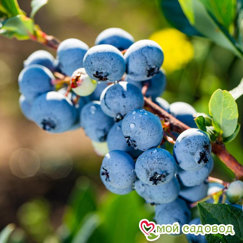 ☀️ Высаживать саженцы голубики с закрытой корневой системой можно на протяжении всего вегетационного периода (весна-лето-осень). Посадку голубики весной в открытый грунт следует проводить после исчезновения угрозы возвратных заморозков, когда воздух прогреется до 10-15⁰С, но до распускания почек (в апреле-мае). Таким образом, саженец будет иметь достаточно времени, чтобы укорениться и адаптироваться к новым условиям. Осенью к посадочным работам приступают в конце сентября-начале октября.. после того, как растение закончит вегетацию и останется без листьев. При этом оно будет иметь в своем распоряжении 3-4 недели до устойчивых морозов для укоренения. Голубика Блюголд — ягоды голубики этого популярного сорта светло-синие, с плотной ароматной мякотью. Да и сами кустики пышные и красивые, поэтому станут прекрасным украшением любого сада. Однако стоит учесть, что раскидистость – это одновременно и недостаток кустов этого сорта, ведь они требуют сильной обрезки. Блюголд – ранний сорт. Плоды приобретают насыщенный цвет еще в начале лета и дружно созревают к середине июля. С одного куста собирают от 4,5 кг ягод даже в не самые урожайные годы. Эта голубика стойко выдерживает морозы до –35°С, поэтому подходит для выращивания в северных регионах. Слабая сторона сорта – его ягоды быстро завяливаются, мумифицируются, особенно если лето стоит жаркое. ПОСАДКА Перед посадкой полейте растение в контейнере и дайте ему постоять, чтобы можно было легко вынуть саженец из контейнера не повредив корневую систему. Подготовьте посадочную яму глубиной и шириной примерно 0,5 м. Добавьте в неё кислую песчано-земляную смесь (лучше если это будет специализированный грунт с повышенной кислотностью рН) и перемешайте с почвой, вынутой из ямки. Можно улучшить структуру почвы, добавив кислого торфа. Посадите растение так, чтобы оно оказалось на несколько сантиметров ниже, чем оно сидело в горшке. Слегка уплотните землю вокруг саженца и еще раз полейте как следует. Для предотвращения испарения влаги покройте почву слоем мульчи (опилки, кора) толщиной 5-8 см.  Это позволит решить и ещё ряд проблем. Во-первых, слой мульчи позволит избавиться от сорняков, во-вторых, отрегулирует водно-воздушный и температурный режим верхнего слоя почвы (т.е. почва не пересыхает и не перегревается), в третьих, он улучшит освещённость куста, в четвёртых, поможет бороться с болезнями.
