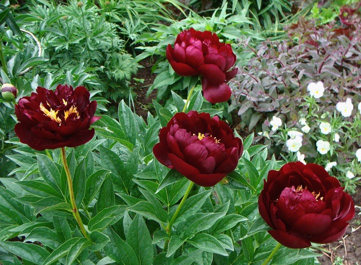 Особый полумахровый пион с исключительными цветами. Очень глубокий и темно-красный. Цветок очень темный, черновато-красный, пяти-шести рядный с крупными желтыми тычинками, которые подсвечивают его изнутри. Темно-зеленые листочки над красноватыми стеблями. Пион имеет особенный цвет, куст невысокий и компактный. Стебли прямые, прочные.