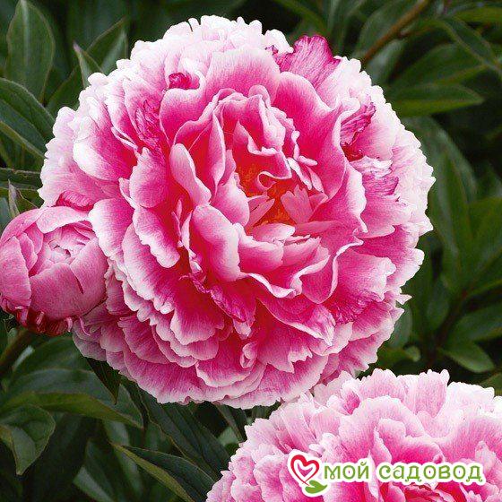 Кёнингин Вильгельмина (Paeonia Koningin Wilhelmina) — Цветок густомахровый, с воронкой в центре, светло-розовый с насыщением в глубине. Тонкий аромат