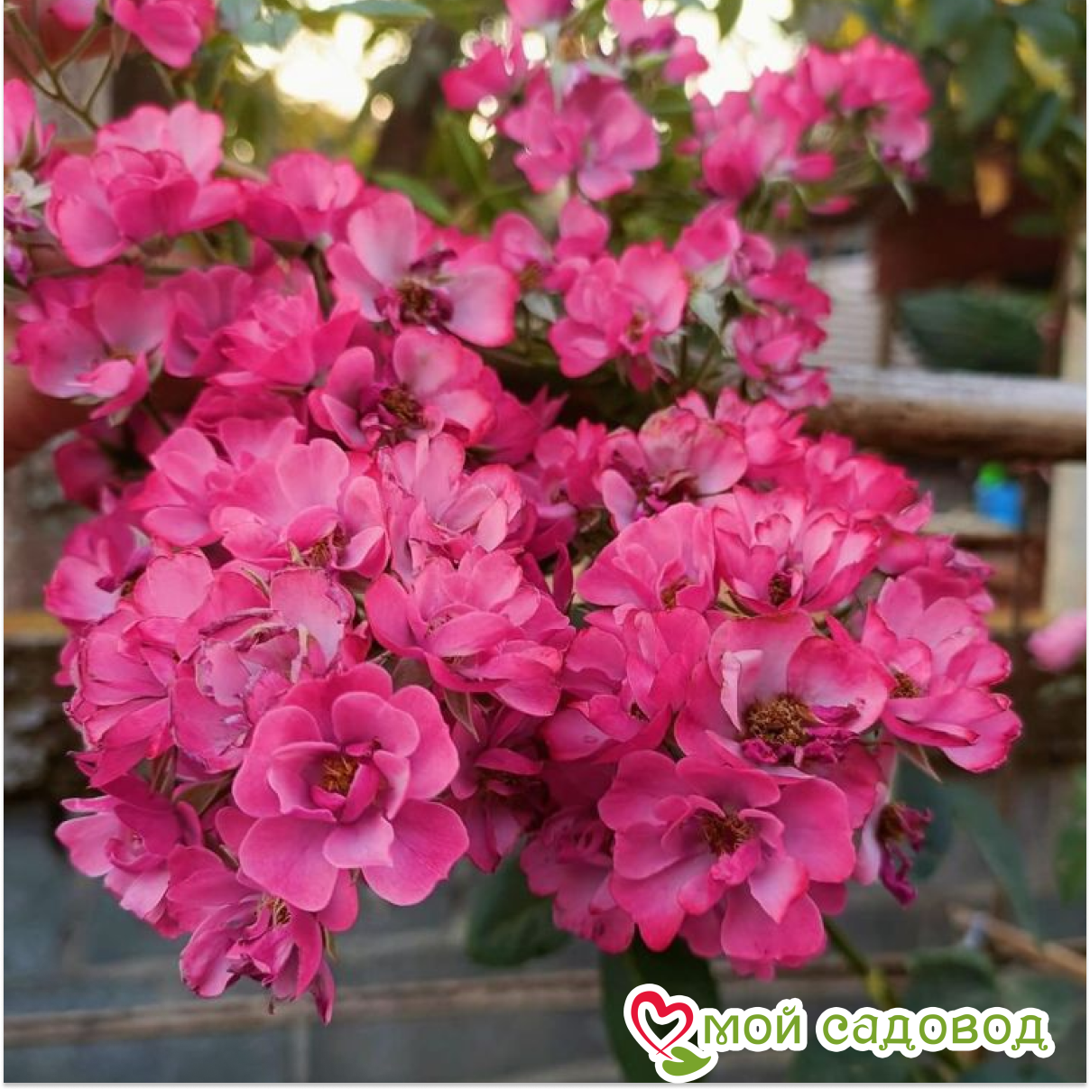Цветки малиновые с белой серединкой и желтыми тычинками, полумахровые, мелкие, собраны в большие кисти по 20-50 шт., похож на гортензию. Цветёт роза однократно в течении месяца. Куст раскидистый очень мощный , ветви до 1.5 метров, без шипов. Зимостойкий, не болеет. Уход за розами заключается в систематическом рыхлении грунта, удалении сорняков, профилактике заболеваний, подкормке и обрезке. Подкормку роз проводят сезонно: азотом – весной, фосфором и калием – летом. Несмотря на засухоустойчивость, полив роз – процедура обязательная, особенно в жаркие и засушливые периоды. Поливают растения не холодной водой из расчета на куст 15-20 л воды, в сухую и теплую погоду – два раза в неделю. К концу лета полив сокращается и прекращается вовсе с наступлением сентября. В первый год допускать раннего цветения молодых растений не следует. Вплоть до начала августа бутоны роз с кустов удаляют. В августе оставляют по 1-2 цветка на каждом побеге и не срезают их, чтобы осенью завязались плоды. Побеги розы в таком случае лучше вызревают, хорошо перезимовывают и на будущий год обильно цветут. В нашем интернет-магазине вы сможете купить Чайно-гибридные розы Так же возможно вас заинтересуют Роза Бургунд-81 и Роза Версилия.