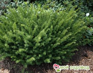 При выборе участка для посадки рассады предпочтение желательно отдать лёгкой полутени или солнечным местам. Важно, чтобы там не было застойных грунтовых вод. Допустима и посадка в тени, но в этом случае есть вероятность, что кустарник будет слабым, а хвоя блёклой. Посадочные лунки по размеру могут отличаться. Обычно их диаметр равен 60 – 80 см, в зависимости от объёма корневища. На дне организовывают дренажный слой из битого кирпича, гальки или камней (толщиной около 15 см). Оптимальный состав субстрата: верхний плодородный слой почвы, песок и торф (в пропорции 2:1:1). Корневая шейка при посадке должна располагаться на уровне грунта.